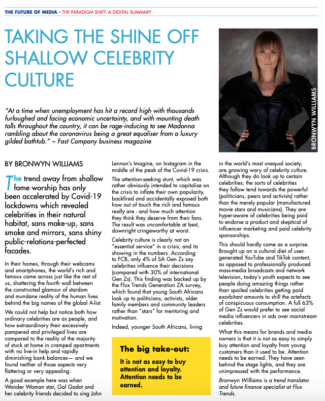 Taking the Shine – Media 24 Type: Interviews Related Published by bronwynruthwilliams Futures. Field Agent. Speaker. Spy. View all posts by bronwynruthwilliams